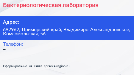 Бактериологическая лаборатория по адресу 692962, Приморский край, Владимиро-Александровское, Комсомольская, 56 в дальнейшем Организация, размещена в следующих категориях: