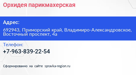 Орхидея, парикмахерская по адресу 692943, Приморский край, Владимиро-Александровское, Восточный проспект, 4а в дальнейшем Организация, размещена в следующих категориях: