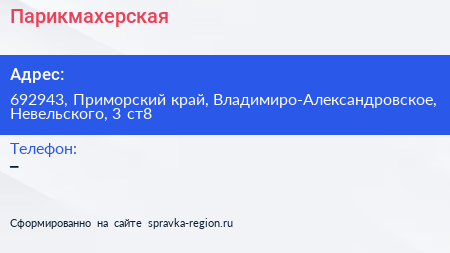 Парикмахерская по адресу 692943, Приморский край, Владимиро-Александровское, Невельского, 3 ст8 в дальнейшем Организация, размещена в следующих категориях: