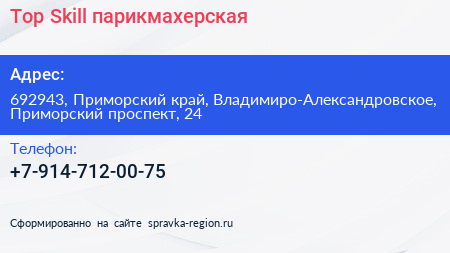 Top Skill, парикмахерская по адресу 692943, Приморский край, Владимиро-Александровское, Приморский проспект, 24 в дальнейшем Организация, размещена в следующих категориях:
