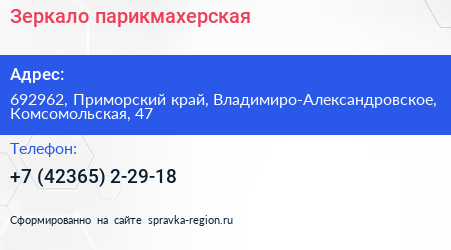 Зеркало, парикмахерская по адресу 692962, Приморский край, Владимиро-Александровское, Комсомольская, 47 в дальнейшем Организация, размещена в следующих категориях: