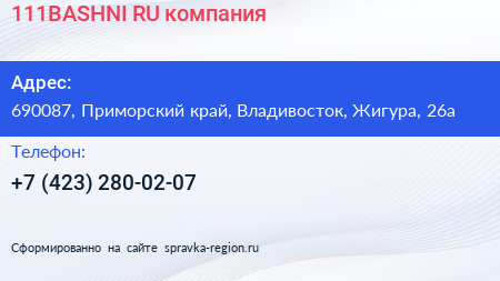 111BASHNI.RU, компания по адресу 690087, Приморский край, Владивосток, Жигура, 26а в дальнейшем Организация, размещена в следующих категориях: