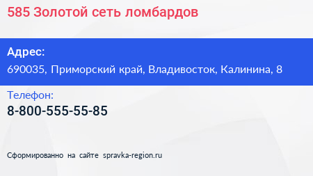 585*Золотой, сеть ломбардов по адресу 690035, Приморский край, Владивосток, Калинина, 8 в дальнейшем Организация, размещена в следующих категориях: