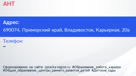 АНТ по адресу 690074, Приморский край, Владивосток, Карьерная, 20а в дальнейшем Организация, размещена в следующих категориях: