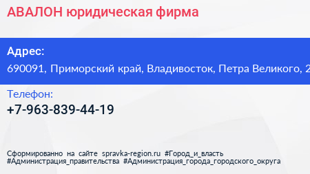 АВАЛОН, юридическая фирма по адресу 690091, Приморский край, Владивосток, Петра Великого, 2 в дальнейшем Организация, размещена в следующих категориях: