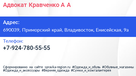 Адвокат Кравченко А.А. по адресу 690039, Приморский край, Владивосток, Енисейская, 9а в дальнейшем Организация, размещена в следующих категориях: