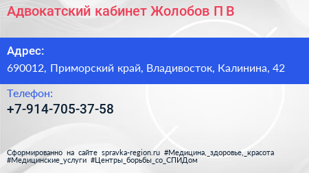 Адвокатский кабинет Жолобов П.В. по адресу 690012, Приморский край, Владивосток, Калинина, 42 в дальнейшем Организация, размещена в следующих категориях: