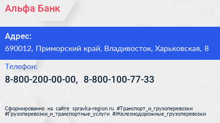 Альфа-Банк по адресу 690012, Приморский край, Владивосток, Харьковская, 8 в дальнейшем Организация, размещена в следующих категориях: