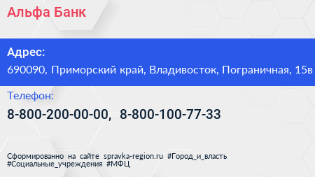 Альфа-Банк по адресу 690090, Приморский край, Владивосток, Пограничная, 15в в дальнейшем Организация, размещена в следующих категориях: