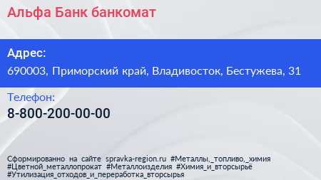 Альфа-Банк, банкомат по адресу 690003, Приморский край, Владивосток, Бестужева, 31 в дальнейшем Организация, размещена в следующих категориях: