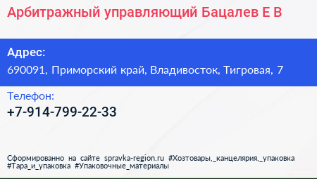 Арбитражный управляющий Бацалев Е.В. по адресу 690091, Приморский край, Владивосток, Тигровая, 7 в дальнейшем Организация, размещена в следующих категориях: