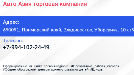 Авто Азия, торговая компания по адресу 690091, Приморский край, Владивосток, Уборевича, 10 ст9 в дальнейшем Организация, размещена в следующих категориях: