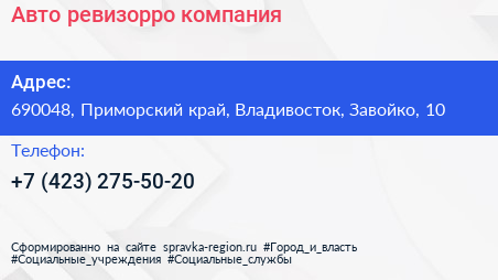 Авто-ревизорро, компания по адресу 690048, Приморский край, Владивосток, Завойко, 10 в дальнейшем Организация, размещена в следующих категориях: