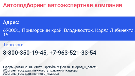 Автоподборинг, автоэкспертная компания по адресу 690001, Приморский край, Владивосток, Карла Либкнехта, 15 в дальнейшем Организация, размещена в следующих категориях: