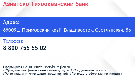 Азиатско-Тихоокеанский банк по адресу 690091, Приморский край, Владивосток, Светланская, 56 в дальнейшем Организация, размещена в следующих категориях:
