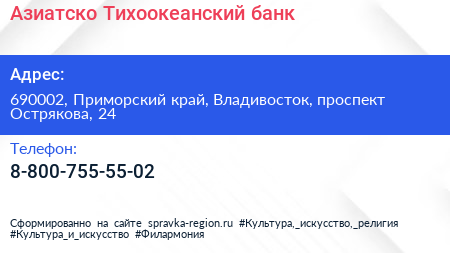 Азиатско-Тихоокеанский банк по адресу 690002, Приморский край, Владивосток, проспект Острякова, 24 в дальнейшем Организация, размещена в следующих категориях: