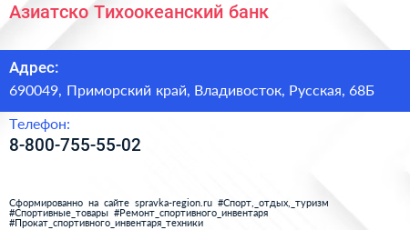 Азиатско-Тихоокеанский банк по адресу 690049, Приморский край, Владивосток, Русская, 68Б в дальнейшем Организация, размещена в следующих категориях: