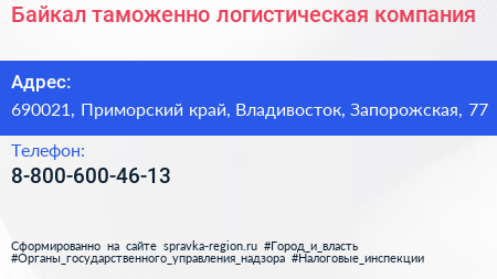 Байкал, таможенно-логистическая компания по адресу 690021, Приморский край, Владивосток, Запорожская, 77 в дальнейшем Организация, размещена в следующих категориях: