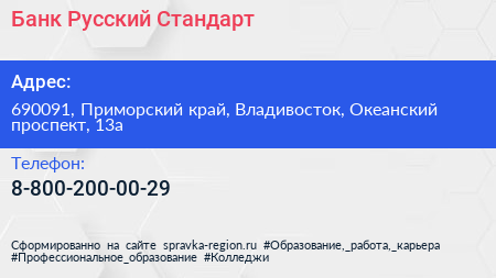 Банк Русский Стандарт по адресу 690091, Приморский край, Владивосток, Океанский проспект, 13а в дальнейшем Организация, размещена в следующих категориях: