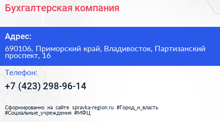 Бухгалтерская компания по адресу 690106, Приморский край, Владивосток, Партизанский проспект, 16 в дальнейшем Организация, размещена в следующих категориях: