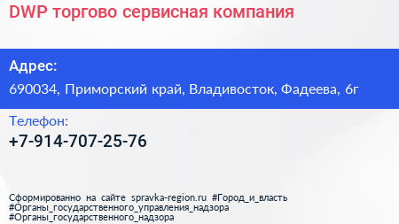 DWP, торгово-сервисная компания по адресу 690034, Приморский край, Владивосток, Фадеева, 6г в дальнейшем Организация, размещена в следующих категориях: