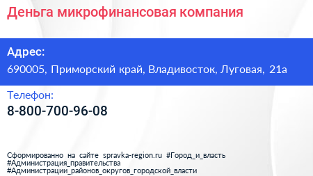 Деньга, микрофинансовая компания по адресу 690005, Приморский край, Владивосток, Луговая, 21а в дальнейшем Организация, размещена в следующих категориях: