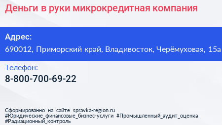 Деньги в руки, микрокредитная компания по адресу 690012, Приморский край, Владивосток, Черёмуховая, 15а в дальнейшем Организация, размещена в следующих категориях: