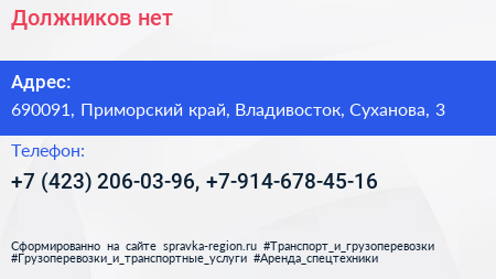 Должников нет по адресу 690091, Приморский край, Владивосток, Суханова, 3 в дальнейшем Организация, размещена в следующих категориях: