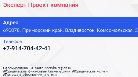 Эксперт-Проект, компания по адресу 690078, Приморский край, Владивосток, Комсомольская, 3 в дальнейшем Организация, размещена в следующих категориях: