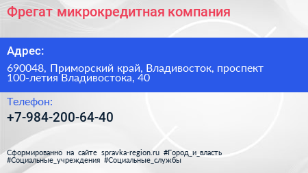 Фрегат, микрокредитная компания по адресу 690048, Приморский край, Владивосток, проспект 100-летия Владивостока, 40 в дальнейшем Организация, размещена в следующих категориях: