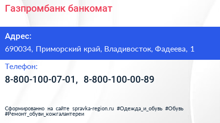 Газпромбанк, банкомат по адресу 690034, Приморский край, Владивосток, Фадеева, 1 в дальнейшем Организация, размещена в следующих категориях: