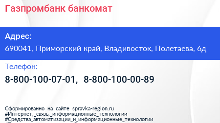 Газпромбанк, банкомат по адресу 690041, Приморский край, Владивосток, Полетаева, 6д в дальнейшем Организация, размещена в следующих категориях: