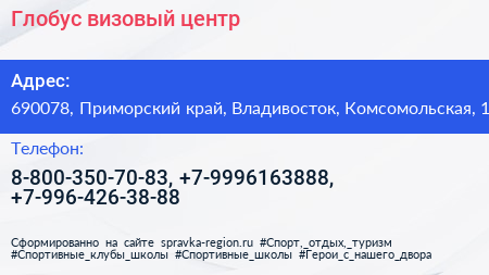 Глобус, визовый центр по адресу 690078, Приморский край, Владивосток, Комсомольская, 1 в дальнейшем Организация, размещена в следующих категориях: