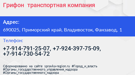 Грифон+, транспортная компания по адресу 690025, Приморский край, Владивосток, Фанзавод, 1 в дальнейшем Организация, размещена в следующих категориях: