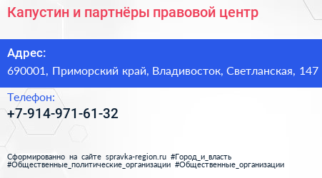 Капустин и партнёры, правовой центр по адресу 690001, Приморский край, Владивосток, Светланская, 147 в дальнейшем Организация, размещена в следующих категориях: