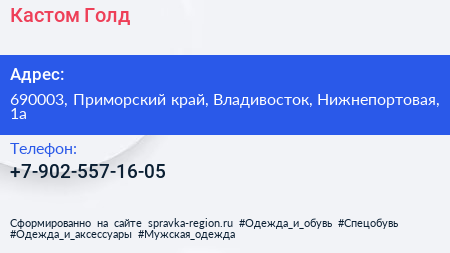 Кастом Голд по адресу 690003, Приморский край, Владивосток, Нижнепортовая, 1а в дальнейшем Организация, размещена в следующих категориях: