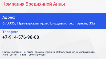 Компания Бредихиной Анны по адресу 690005, Приморский край, Владивосток, Горная, 33а в дальнейшем Организация, размещена в следующих категориях: