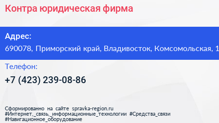 Контра, юридическая фирма по адресу 690078, Приморский край, Владивосток, Комсомольская, 1 в дальнейшем Организация, размещена в следующих категориях: