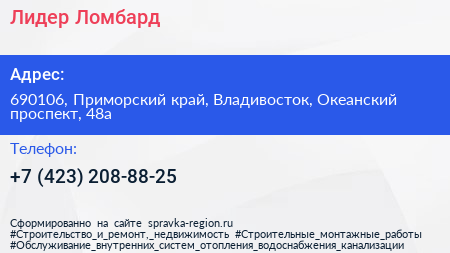 Лидер Ломбард по адресу 690106, Приморский край, Владивосток, Океанский проспект, 48а в дальнейшем Организация, размещена в следующих категориях: