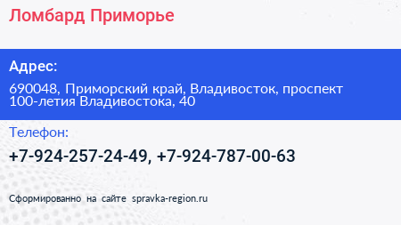 Ломбард Приморье+ по адресу 690048, Приморский край, Владивосток, проспект 100-летия Владивостока, 40 в дальнейшем Организация, размещена в следующих категориях: