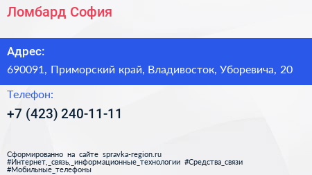 Ломбард София по адресу 690091, Приморский край, Владивосток, Уборевича, 20 в дальнейшем Организация, размещена в следующих категориях: