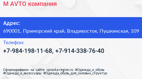 M-AVTO, компания по адресу 690001, Приморский край, Владивосток, Пушкинская, 109 в дальнейшем Организация, размещена в следующих категориях: