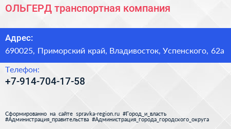 ОЛЬГЕРД, транспортная компания по адресу 690025, Приморский край, Владивосток, Успенского, 62а в дальнейшем Организация, размещена в следующих категориях: