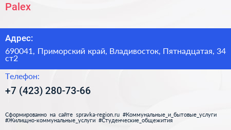 Palex по адресу 690041, Приморский край, Владивосток, Пятнадцатая, 34 ст2 в дальнейшем Организация, размещена в следующих категориях: