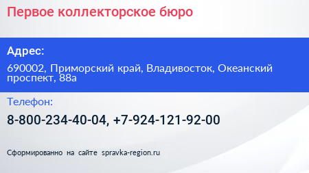 Первое коллекторское бюро по адресу 690002, Приморский край, Владивосток, Океанский проспект, 88а в дальнейшем Организация, размещена в следующих категориях: