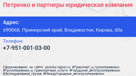 Петренко и партнеры, юридическая компания по адресу 690068, Приморский край, Владивосток, Кирова, 60а в дальнейшем Организация, размещена в следующих категориях: