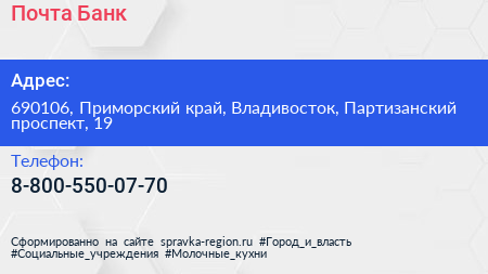 Почта Банк по адресу 690106, Приморский край, Владивосток, Партизанский проспект, 19 в дальнейшем Организация, размещена в следующих категориях:
