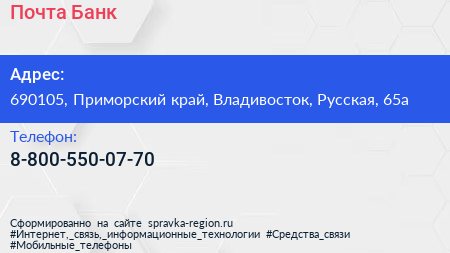Почта Банк по адресу 690105, Приморский край, Владивосток, Русская, 65а в дальнейшем Организация, размещена в следующих категориях: