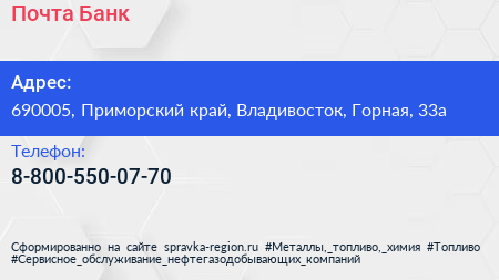 Почта Банк по адресу 690005, Приморский край, Владивосток, Горная, 33а в дальнейшем Организация, размещена в следующих категориях: