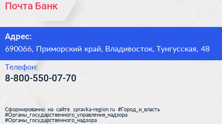 Почта Банк по адресу 690066, Приморский край, Владивосток, Тунгусская, 48 в дальнейшем Организация, размещена в следующих категориях: